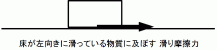 滑っている物質 が 接触している物質 に対して及ぼす「 滑り摩擦力( 動摩擦力 )」の向きは移動方向です。一方、滑っている物質に接触している物質 が 滑っている物質 に対して及ぼす「 滑り摩擦力 」の向きは、滑っている物質の移動方向と逆です。これらは作用反作用の関係にあります。滑り摩擦 は 動摩擦 とも言われます。「 動摩擦力 」の大きさは「 最大静止摩擦力 」の大きさに比べて小さいです。