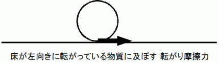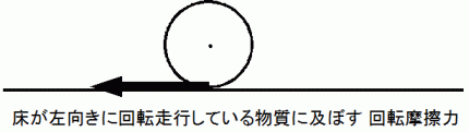 「 回転摩擦力 」は、私が自分勝手に作った言葉です。転倒回転移動している物質 が 接触している物質 に対して及ぼす「 転がり摩擦力 」の向きは、「 滑り摩擦力( 動摩擦力 )」の方向と同じで、物質の移動方向です。一方、転倒回転移動している物質に接触している物質 が 転倒回転移動している物質 に対して及ぼす「 転がり摩擦力 」の向きは、転がっている物質の移動方向の逆です。これらは作用反作用の関係にあります。「 転がり摩擦力 」の大きさは「 滑り摩擦力 」の大きさに比べて1万分の1とも言われています。