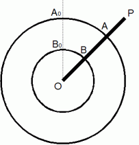 の外円および内円の交点を、 それぞれ A、 B とします。 時刻 0秒 から 時刻 1秒 の時間において、 時刻
