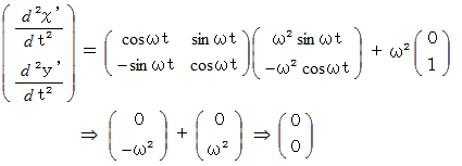 ' さんからするとA君の座標は等速自転座標系になります。 そこで、 等速自転座標系における加速度の公式を用いて、 A君の座標系ではB君の加速度が0であることを確かめてみましょう。