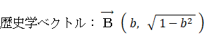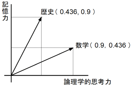 数学には、論理的思考力が 67.4%、記憶力が 32.6% 必要です。歴史には、論理的思考力が 32.6%、記憶力が 67.4% 必要です。必要とされる知能の観点から、この2つの教科の相関係数を求めてみましょう。それには、論理的思考力を横軸とし記憶力を縦軸とする座標系の中で、数学知能ベクトル と 歴史知能ベクトル をそれぞれ大きさ1のベクトルで表し、その2つの内積をとればいいのです。