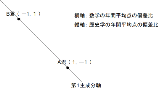 A君の数学と歴史学の年間平均点の偏差比の加工された第1主成分は次のようになります。