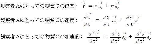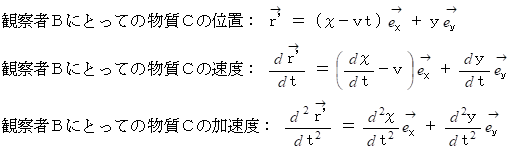 これから分かることは、 観察者A と 観察者B にとって、 物質Cの位置や速度は異なりますが、 物質Cの加速度は同じであると言うことです。