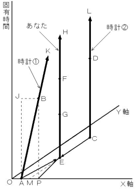の時刻を、 同時に測定してください。 そして、 その差を比較すれば、 2つの相対時間( 固有時間 )の差がわかります。 しかし、 ここで1つ注意しておかなければならないことがあります。 それは、 あなたが、 時空点Aに存在するときの 時計