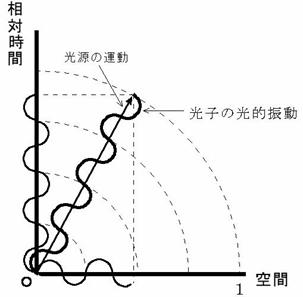 図0202 を見てください。 光子の電磁波的振動は、 振動する光子の容器である光源の空間移動によって、 相対時間方向へ実現されるだけでなく、 空間方向へも実現され、 その相対時間方向の振動だけが、 空間に光の速さで伝わって行くのです。 ですから、 光源が空間を移動する程度が大きければ大きい程、 その間の相対時間が短くなりますので、 相対時間方向の振動数は少なくなり、 空間を伝わってくる光の振動数は、 少なくなります。