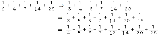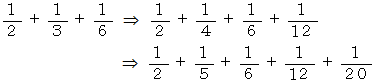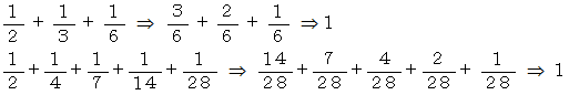 古典的方法まず、 完全数 ( すべての約数の和が自分自身に等しい自然数 ) を使って単位分数分解を行います。