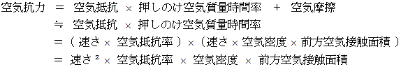 空気抗力 が速さの2乗におよそ比例するのは事実ですが、 実は、 速さは 空気抵抗 の比例的要素なのです。 空気抵抗以外に空気抗力の比例的要素となっているのが、 単位時間あたりに通過する空間に存在する空気の質量で、 それは、 空気密度 と 前方空気接触面積( 進行方向に垂直な平面への投影面積 )と 速さ とを掛け合わせたものです。 したがって、 空気抗力は速度の2乗に比例しているのです。 また、 速さ以外に前方形状も空気抵抗の比例的要素になっています。 以上が空気抗力の主体なのですが、 これに加算される 空気摩擦 があます。 空気摩擦は、 大気圏突入物質の温度上昇の原因になるものです。 空気摩擦には、 空気の粘性 や 摩擦面の構造 や 物質の速さ が関与します。