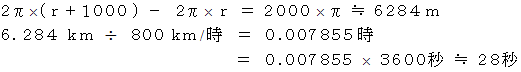 私たちは、 しばしば、 半径の比較的短い 内円と外円の円周の長さの比 のイメージでもって、 半径の比較的長い 内円と外円の円周の長さの差 をイメージしてしまいますが、 高度 1000 m の上空 と 高度 2000 m の上空 を、 2台のジェット機が 時速 800 km で飛んで地球を一周するとき、 飛行時間の差は、 たったの 28秒 であることを証明してみましょう。