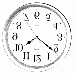 もう何年も通っている理髪店です。 散髪中ふと気づきました。 鏡の中の時計が普通なのです。 テレビの中の人はみんな左手で箸を握っているのに。 その時計は、 3時なのに9時を示し、 長針も短針も反時計回りに回転します。 わざわざそういう時計が作られていたのです。
