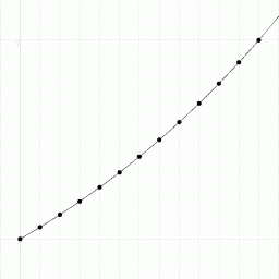の曲線を表しています。 縦軸の値が 1 から 2 の間に 13個 の点があります。 これは、 平均律音階で半音上昇する度に振動数比がいくらになるのかを表しています。 一番低い音の振動数を 1 としたとき、 12半音( 1オクターブ )上がると、振動数比は2になります。