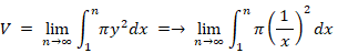 を x 軸を中心にして回転してできる回転体は「トリチェリのトランペット」と言われる。(1) この立体の体積を求めよ。