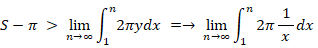 あらゆる x の区間において、その区間の双曲線の長さはその区間の x 軸の長さよりも長くなっているので、この立体の表面積を S とすると、次の式が成り立つ。