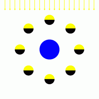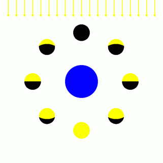 月の満ち欠けは、 一方向からスポットライトを当てられた球を、 どの角度から観察するかによるものです。 光源の方から球を見ると満月のようになります。 光源の反対方向から球を見ると新月のようになります。光源から球を中心にして90度時計回りに回転移動してから球を見ると、 半月のようになります。