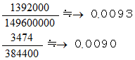 次の式たちより、 地球から見た太陽の見かけの大きさ は 地球から見た月の見かけの大きさ よりも少しだけ大きいことが解ります。