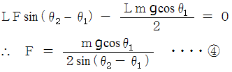 の角度を保った所で静止しました。 このときの、 紐を引く力の大きさ、 鉄棒の一端が床から受ける垂直抗力の大きさ、 鉄棒の一端が床から受ける静止摩擦力の大きさ を求めてみましょう。