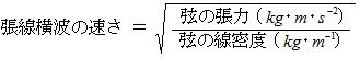 弦を振動させたときに生じる定常波の中では、 その振動数の整数倍のたくさんの張線横波が弦の一端から他端までの間を同じ速さで行ったり来たりしています。 弦を振動させたときに生じる音の高さは、 弦の定常波の振動数によって決まり、 定常波の振動数は、次の式によって決まります。