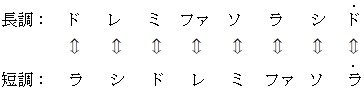 長調を短調化するには、 ミ と ラ と シ を半音下げて、上記の音階変換をすればいいです。
