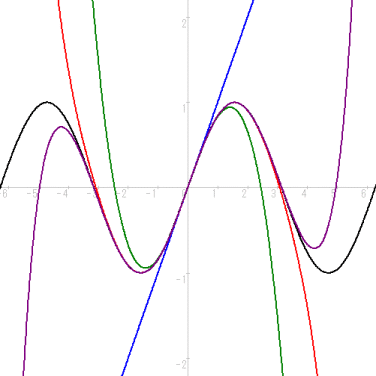 例として、曲線 y = sin x をまず描出し、次に x=0 の近傍で y = sin x に近似する直線を表示し、その後少しずつ x の範囲を広げていきながら、y = sin x に近似する曲線を表示していきます。つまり、これは sin x のマクローリン展開の 1次近似式、3次近似式、5次近似式、7次近似式、と順に描いていくプログラムです。