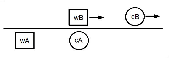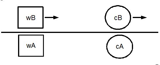 B氏の当事者的な客観的観察による、 置時計A の光が、 静止しているとみなされるA氏に衝突してくる、 時刻( B氏が見るA氏の腕時計を用いて測定 ) 」 とは等しくなっている。 ただし、 置時計が光った時刻は、 前者よりも後者の方が後になっている。2人の見解をまとめてみる。 移動の対称性より、