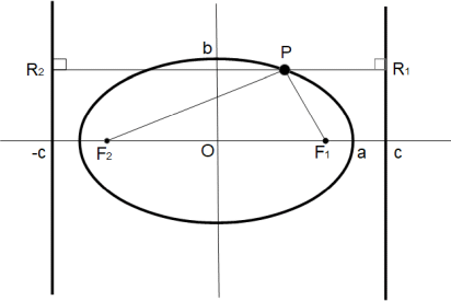 y 軸上にあり、中心が原点にある楕円です。点Fは焦点です。