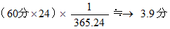 オリオン座の恒星ベテルギウスは、 明石( 東径135度, 北緯34.4度 )では、 冬至の 23時55分頃に、 子午線( 天の北極 と 天頂 と 天の南極 を結ぶ線 )上の (90−34.4) + 7.4 = 63 度 の高度にあります。 その後、 この星は、日毎におよそ4分ずつ南中時刻を早くしていき、 春分には 17時55分頃に南中するようになります。 その理由は、 次の式にあります。 これは、 地球が太陽の周りを 365.24日かけて正円軌道を描いて公転していると仮定して導いたものです。