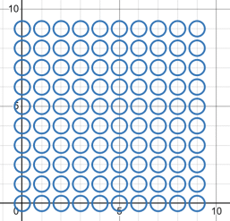 次のような式を作っても同じ図が書けます。 \[ \begin{flalign} \ \ \ \ \ \ \ \ \ \ \ \left(\frac{\left(\operatorname{mod}\left(x-0.5,1\right)-0.5\right)}{0.6}\right)^{2}+\left(\frac{\left(\operatorname{mod}\left(y-0.5,1\right)-0.5\right)}{0.6}\right)^{2}=0.5\ \left\{-0.5\le x\le9.5\right\}\left\{-0.5\le y\le9.5\right\}&& \end{flalign} \]