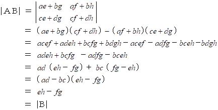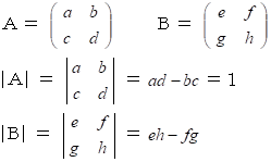 行列Aと行列Bの積は行列ABですが、 このことを「 行列Bに対して演算子としての行列Aを作用させると行列ABになる。」と表現することがあります。 この表現法に従って言えば、 次のような真の命題があります。「 演算子としての行列Aの行列式が 1 のとき、 行列Bに対して行列Aを作用させて得られる行列の行列式は行列Bの行列式に等しい。」