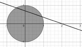 \( a=\large\frac{\ x+y+2\ }{\ x+y-2\ }\ \) と置くと、 \[ \begin{flalign} \ \ \ \ \ \ \ y=\frac{a-1}{\ a+1\ }x+\frac{\ -2a+2\ }{a+1}&& \end{flalign} \] この直線の原点からの距離 \(L\) は次のようになります。 \[ \begin{flalign} \ \ \ \ \ \ \ L=\frac{\left|\frac{\ -2a+2\ }{a+1}\right|}{\ \sqrt{\left(\frac{a-1}{\ a+1\ }\right)^{2}+1\ }}&& \end{flalign} \] 直線 \( \ y=\frac{a-1}{\ a+1\ }x+\frac{\ -2a+2\ }{a+1}\ \) が 円 \( \small\ x^{2}+y^{2}\le 1\ \) と共通部分を持つための必要条件は \( L\le 1 \) です。