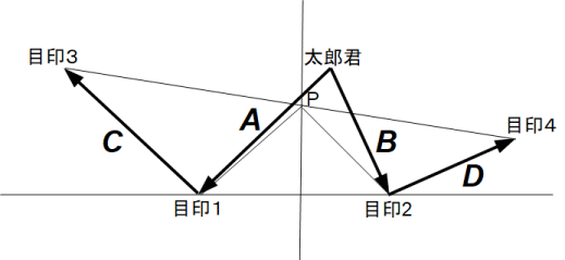 太郎君にとっての 目印1 の位置ベクトルを A とし、太郎君にとっての 目印2 の位置ベクトルを B とします。目印1 にとっての 目印3 の位置ベクトルを C とし、目印2 にとっての 目印4 の位置ベクトルを D とします。目印3 と 目印4 の中点を P とします。点 P にとっての 目印1 の位置ベクトルを E とし、点 P にとっての 目印2 の位置ベクトルを F とします。