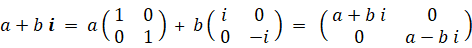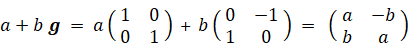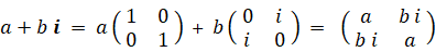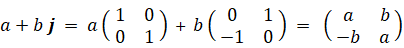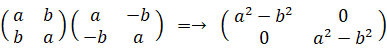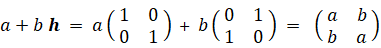 四元数の話はこれでおしまいですが、複素数の行列表現が何種類もあることに気づかれた方があるんじゃないでしょうか? 最も簡単な複素数の行列表現は次の方法です。( i の代わりに h を用いています。)