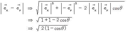 ラジアンの2次元斜交座標における基底ベクトルの和と差の大きさ