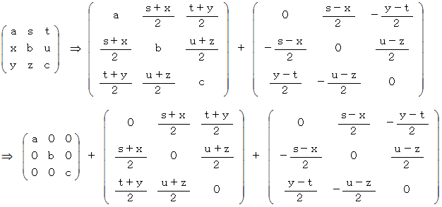を外積させる演算をします。「 対称行列 」を表現行列に持つ演算テンソルは「 対称テンソル 」といわれて、「 直交行列 」である「 対角化行列 」と その逆行列によって、「 対角行列 」を表現行列に持つ演算テンソルへと座標変換されます。 これを「 直交行列による対称行列の対角化 」といいます。