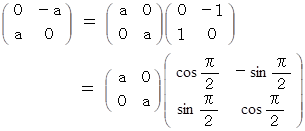 を表現行列とする演算テンソルは、ベクトルを反時計回りに90度回転した上でその大きさをa 倍 にする。なぜなら、