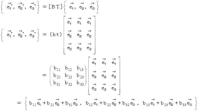 を基底とするベクトル空間での、 演算テンソルの作用によるベクトルの写像 」に座標変換してみましょう。写像前のベクトルは、 2つのベクトル空間で同一のベクトルであり、 かつ、 写像後のベクトルも、 2つのベクトル空間で同一のベクトルです。